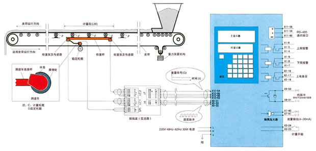 上述兩個被測量的物理量(重量和速度)被同時(shí)傳到稱重積算儀中, 電子皮帶秤重量和速度兩個物理量在稱重積算儀中被立即(約0.0001秒)計(jì)算成為法定重量單位(公斤 -kg,噸 -t,磅 -lb),并按用戶的設(shè)定顯示出瞬時(shí)流量和累計(jì)量。同時(shí)送出各遠(yuǎn)傳信號。